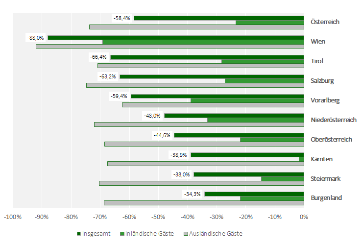 Differenziert man nach der Herkunft der Gäste zeigen sich insbesondere bei den ausländischen Gästen deutliche Rückgänge. Verglichen mit dem Vorjahresmonat nahmen die Ankünfte von Gästen ausländischer Herkunft in der Steiermark im Juni 2020 um fast drei Viertel ab (-72,6 %) (Österreich: -76,2 %) und auch bei den Nächtigungen blieben ausländische Gäste weitgehend aus (Steiermark – 70,3 %; Österreich -73,7 %). Auch die inländischen Gäste zeigten sich in ihrer Reiselust zurückhaltend, österreichweit lag der Rückgang bei den Nächtigungen im Juni 2020 bei -23,4 %, in der Steiermark fiel der Rückgang mit -14,7 % etwas moderater aus. Der moderatere Rückgang bei den heimischen Gästen wirkt in der Pandemie zwar stabilisierend, jedoch kann das Ausbleiben von zahlungskräftigen Gästen aus dem Ausland nicht kompensiert werden.