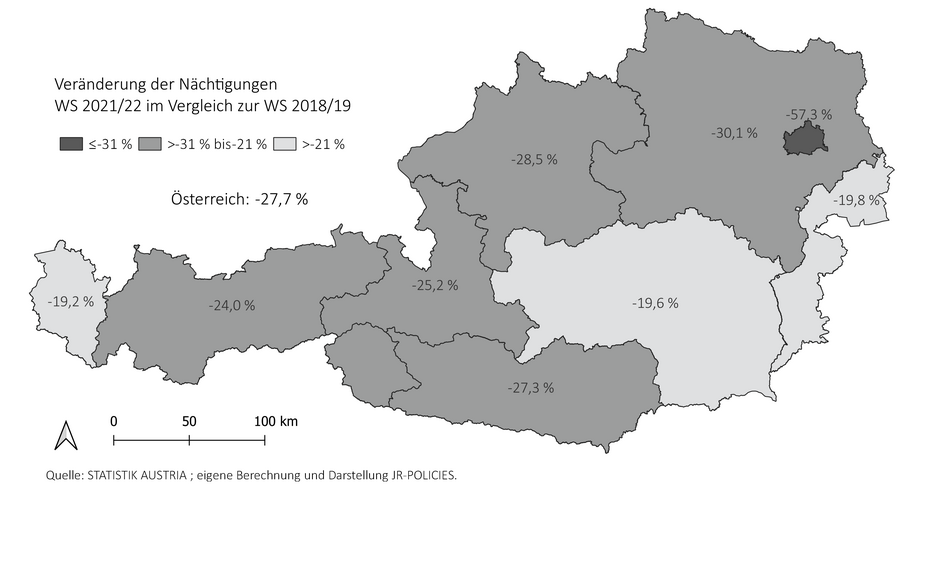 (4,3 %), Polen (2,2 %) sowie den Niederlanden (2,1 %). Deutschland bleibt in der Wintersaison damit weiterhin der wichtigste ausländische Herkunftsmarkt, obwohl die Nächtigungen der Wintersaison 2021/22 um -18,2 % bzw. -193.817 Nächtigungen niedriger ausfielen als vor der Corona-Pandemie (2018/19).