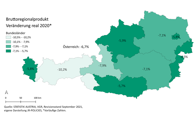 Folgt man den vorläufigen Zahlen der Regionalen Gesamtrechnung (RGR) der Statistik Austria verlief die Wirtschaftsentwicklung in dem von der Coronapandemie geprägten Jahr 2020 in allen Bundesländern rückläufig. In der Steiermark betrug der Rückgang des realen Bruttoregionalprodukts im Jahr 2020 -7,1 % (Werte 2020: vorläufige Zahlen). Der Rückgang fiel überdurchschnittlich hoch aus (Österreich: -6,7 %). Gemeinsam mit Niederösterreich liegt die Steiermark auf Rang sechs im Bundesländervergleich, stärkere Rückgänge wurden lediglich in Tirol (-10,2 %) sowie in Salzburg verzeichnet (-7,9 %). Den geringsten Einbruch verzeichnete Kärnten mit -5,7 %. Auch in Bezug zur Einwohnerzahl (BRP/Einwohner), fiel der reale Rückgang in der Steiermark mit -7,3 % überdurchschnittlich aus (Österreich: -7,1 %).