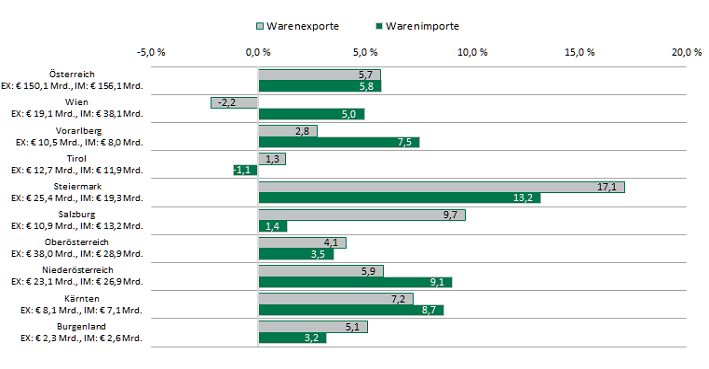 Die Steiermark erzielte im Jahr 2018 in beide Warenhandelsrichtungen die relativ und absolut höchsten Ausweitungen aller Bundesländer. Die Warenexporte stiegen um +17,1 % auf einen neuen Rekordwert von € 25,4 Mrd. Die Warenimporte stiegen um +13,2 % auf € 19,3 Mrd. Die Warenhandelsbilanz betrug € +6,2 Mrd. und lag damit um € +1,5 Mrd. bzw. +31,2 % höher als im Jahr 2017. Die Steiermark konnte sich auch bezüglich des gesamten Warenexportvolumens vom dritten auf den zweiten Rang verbessern und verdrängte damit Niederösterreich (€ 23,1 Mrd.) auf Platz drei. Erstmals konnte österreichweit im Jahr 2018 das nominelle Warenhandelsvolumen von € 150 Mrd. in beide Verkehrsrichtungen (Importe wir Exporte) überschritten werden.