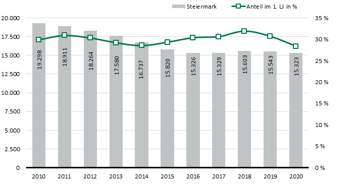 • Der Anteil von Lehrlingen im 1. Lehrjahr in der Steiermark lag mit 28,4 % im Jahr 2020 deutlich niedriger als 2010 mit 29,9 %. In Österreich sank der Anteil von 30,6 % im Jahr 2010 auf 29,5 % im Jahr 2020.