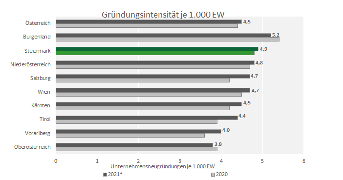 Gemäß der vorläufigen Ergebnisse der Gründungsstatistik der Wirtschaftskammer wurden in der Steiermark im Jahr 2021 6.132 Unternehmensneugründungen und damit um +3,2 % mehr als im Vorjahr verzeichnet, der Anstieg fällt in der Steiermark unterdurchschnittlich aus (Österreich: +4,4 %), wobei insbesondere in den westlichen Bundesländern Salzburg und Tirol (jeweils +12,2 %) sowie in Vorarlberg (+13,6 %) eine deutliche Zunahme zu verzeichnen war, während das Burgenland (-3,4 %) und Oberösterreich (-1,2 %) mit Rückgängen konfrontiert waren. Setzt man die Unternehmensneugründungen in Relation zur Einwohnerzahl, liegt die Steiermark mit einer Gründungsintensität von 4,9 Unternehmensneugründungen je 1.000 Einwohner nach dem Burgenland auf Rang zwei.