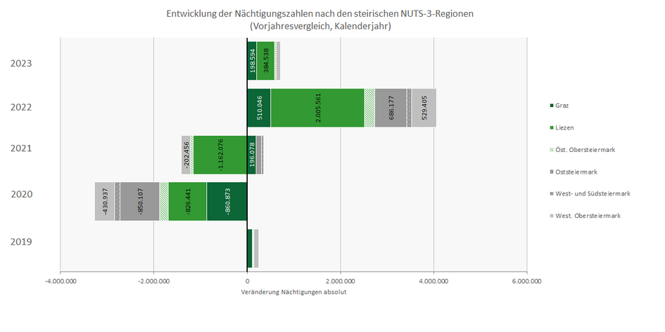 Nach wie vor ist der Bezirk Liezen die nächtigungsstärkste Region in der Steiermark. Mit 5,3 Mio. Nächtigungen wurden rund vier von zehn Nächtigungen in der NUTS-3-Region Liezen verbracht. Auch in Liezen wurde im Kalenderjahr 2023 ein Rekordstand bei den Nächtigungen erzielt. Sowohl im Vorjahresvergleich (+7,8 %) als auch im Vergleich zum Jahr 2019 (+8,1 %) konnten deutliche Zugewinne verbucht werden. Das stärkste Nächtigungsplus war 2023 in der NUTS-3-Region Graz beobachtbar (+11,6 %), mit 1,9 Mio. Nächtigungen wurde auch hier ein Rekord erzielt. Lediglich in der Oststeiermark (-1,6 %) sowie in der Westlichen Obersteiermark (-0,7 %) lag das Niveau der Nächtigungen, trotz Zugewinne, noch leicht unter dem Niveau von 2019.