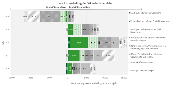 Die im Zuge der Corona-Pandemie gesetzten Maßnahmen wirkten sich durch Zwangsschließungen insbesondere auf die Beschäftigung in Tourismus und Handel aus. Im Bereich Beherbergung und Gastronomie nahm die Zahl der unselbständig Aktivbeschäftigten trotz einer guten Entwicklung in den Sommermonaten im Jahresschnitt um -15,5 % ab (-3.830 unselbständig Aktivbeschäftigte), österreichweit betrug der Rückgang fast ein Fünftel (-19,2 %). Auch der steirische Handel war mit einem Beschäftigungsabbau konfrontiert (-1,1 % bzw. -830 unselbständig Aktivbeschäftigte). Ein deutliches Minus zeigte sich auch im Bereich der Arbeitskräfteüberlasser (-17,4 % bzw. -3.118 unselbständig Aktivbeschäftigte). Hingegen wurde im öffentlichen Bereich (Öffentliche Verwaltung, Unterrichtswesen, Gesundheits- u. Sozialwesen +0,5 % bzw. +671 unselbständig Aktivbeschäftigte) moderat Beschäftigung aufgebaut. Weiterhin vergleichsweise dynamisch entwickelte sich der Bereich der wissenschaftlichen, technischen und IKT-Dienstleistungen (+2,6 % bzw. +933 unselbständig Aktivbeschäftigte).