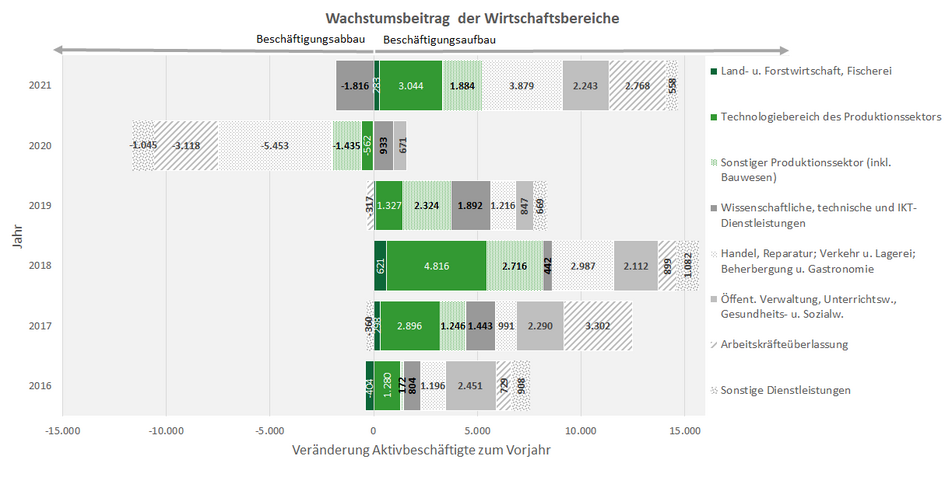 Der Dienstleistungsbereich hat mit 358.223 unselbständig Aktivbeschäftigten im Jahresdurchschnitt 2021 wieder fast das Niveau vor der Corona-Pandemie erreicht (2019: 358.604). Besonders von der Corona-Pandemie betroffen war weiterhin der Tourismus. Nach einem Beschäftigungsrückgang von -15,5 % im Jahr 2020, waren 2021 allerdings wieder mehr Personen im Bereich Beherbergung und Gastronomie beschäftigt (+8,7 % bzw. +1.831 unselbständig Aktivbeschäftigte). Mit 22.770 unselbständig Aktivbeschäftigten bleibt das Niveau vor der Corona-Pandemie jedoch weiter deutlich unterschritten. Ein Beschäftigungsplus verzeichneten auch der Bereich der Arbeitskräfteüberlasser (+18,6 % bzw. +2.768 unselbständig Aktivbeschäftigte) sowie die Wirtschaftsklasse Erbringung von Dienstleistungen der Informationstechnologie (+8,3 % bzw. +635 unselbständig Aktivbeschäftigte). Der Beschäftigungsrückgang bei den wissenschaftlichen und technischen Dienstleistungen ist vermeintlich – korrespondierend zum Beschäftigungsaufbau im Bereich Elektrotechnik und Elektronik – auf die veränderte Branchenzuordnung eines Großunternehmens zurückzuführen. Ohne diese Änderung der Branchenzuordnung hätte der Dienstleistungsbereich ein Wachstum von etwa drei Prozent aufgewiesen, der Bereich der wissenschaftlichen und technischen Dienstleistungen hätte seinen Wachstumspfad fortgesetzt.