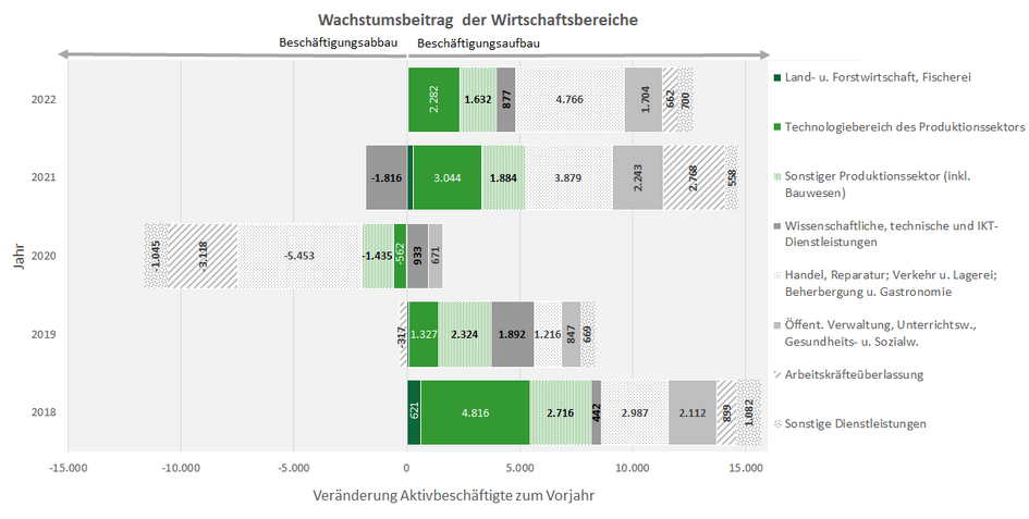 Das Beschäftigungswachstum wurde dabei sowohl von der Industrie als auch vom Dienstleistungsbereich getragen. In der Industrie stieg die Beschäftigung um +2,6 % auf 122.035 unselbständig Aktivbeschäftigte an, mit überdurchschnittlich hohen Wachstumsraten in den Bereichen Elektrotechnik und Elektronik (ÖNACE 26-27, +7,5 %), Maschinenbau (ÖNACE 28, +6,4 %) sowie der pharmazeutischen Erzeugnisse (ÖNACE 21, +5,8 %). Auch im Bauwesen, das selbst während der Pandemie zum Beschäftigungsaufbau beitrug, wurde 2022 mit 41.235 die Beschäftigung nochmals ausgeweitet (+2,0 %). Im Gegensatz dazu waren insbesondere die Branchen Leder, Lederwaren und Schuhe (ÖNACE 15, -16,0 %) sowie die Holzverarbeitung (ÖNACE 16, -2,1 %) mit Beschäftigungsrückgängen konfrontiert.