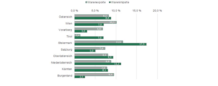 Die Steiermark verzeichnete den höchsten Zuwachs bei den Warenexporten (+11,6 % auf 21,6 Mrd. €) und Warenimporten (+17,3 % bzw. auf 16,9 Mrd. €) aller Bundesländer. Beides sind historische Höchststände. Der steirische Warenbilanzüberschuss betrug 4,6 Mrd. €.