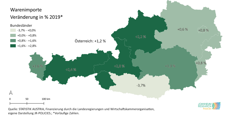 Die Steiermark erzielte im Jahr 2019 sowohl bei Exporten als auch bei Importen (vorläufige Werte) Zuwächse. Die Warenexporte stiegen dabei um +2,6 % auf einen neuen Rekordwert von € 26,1 Mrd. Die Warenimporte stiegen um +1,3 % auf € 19,5 Mrd. Die Warenhandelsbilanz betrug € +6,6 Mrd. und lag damit um € +406 Mio. bzw. +6,6 % höher als im Jahr 2018. Die Steiermark konnte bezüglich des gesamten Warenexportvolumens mit € 26,1 Mrd. den zweiten Rang vor Niederösterreich (€ 22,5 Mrd.) und hinter Oberösterreich (€ 40,1 Mrd.) beibehalten.