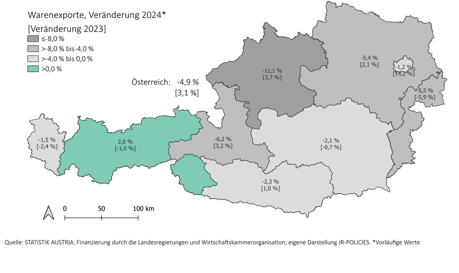 Der steirische Warenaußenhandel realisierte bereits das zweite Jahr in Folge einen Rückgang an Exporten und Importen. Die nominellen Warenexporte der Steiermark sanken nach vorläufigen Ergebnissen der STATISTIK AUSTRIA im Jahr 2024 um 2,1 % auf € 28,28 Mrd. (Österreich: 4,9 %). Die nominellen Warenimporte sanken um 3,7 % auf € 20,95 Mrd. (Österreich: 6,7 %). Die Warenhandelsbilanz betrug € +7,34 Mrd. und lag damit um € +213 Mio. bzw. +3,0 % über dem Vorjahreswert – ein weiterer historischer Höchststand. Österreichweit wurde erstmals seit 16 Jahren (2007) wieder ein Warenhandelsbilanzüberschuss in der Höhe von € +1,74 Mrd. erzielt, nach € 2,02 Mrd. im Vorjahr. Die Steiermark konnte bezüglich des gesamten Warenexportvolumens mit € 28,28 Mrd. den vierten Rang hinter Oberösterreich (€ 48,23 Mrd.), Wien (€ 30,89 Mrd.) und Niederösterreich (€ 28,63 Mrd.) erreichen.