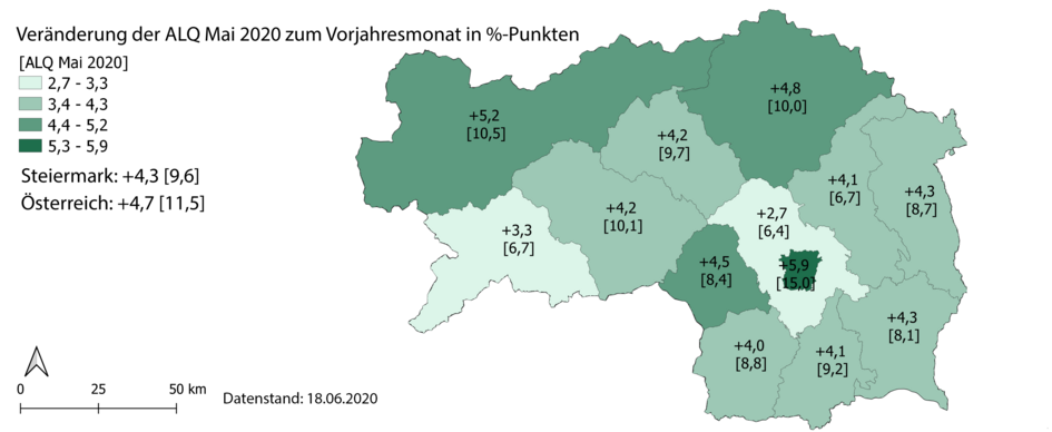 Die Anzahl der am Coronavirus erkrankten Personen ist seit Anfang April rückläufig und Österreich scheint die erste Welle der Pandemie fürs erste gut überstanden zu haben. Die Krise und der damit verbundene Lockdown wirkte sich jedoch auch stark auf die heimische Wirtschaft aus, wie sich an den Entwicklungen am Arbeitsmarkt festmachen lässt, welche schon in den vergangenen beiden Monatsthemen behandelt wurden. Auch dieses Thema ist den aktuellen Entwicklungen gewidmet und behandelt die Betroffenheit der steirischen Bezirke.