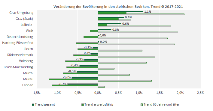 wachstum seit 2017 positiv bzw. stagnierend. Die stärksten Zugewinne verzeichneten die Bezirke Graz-Umgebung (+1,1 % p.a.), Graz (Stadt) sowie Leibnitz (jeweils durchschnittlich +0,6 % p.a.). Die stärksten Rückgänge wurden in Leoben (-0,7 % p.a.), Murau (-0,6 % p.a.) und im Bezirk Murtal (-0,5 % p.a.) beobachtet. Die erwerbsfähige Bevölkerung verzeichnete lediglich in den Bezirken Graz-Umgebung (+0,7 % p.a.), Graz (Stadt) (+0,5 % p.a.) und Leibnitz (+0,2 % p.a.) positive – jedoch verglichen mit der Bevölkerungsentwicklung insgesamt – unterdurchschnittliche jährliche Zuwächse, in allen steirischen Bezirken nahm die ältere Bevölkerung zu. Anteilsmäßig am stärksten vertreten ist die Gruppe der 65-jährigen und älteren Personen in den Bezirken Leoben und Bruck-Mürzzuschlag. Jede vierte Person war in den beiden Bezirken mit Stand 01.01.201 bereits 65 Jahre oder älter. Den stärksten Zugewinn verzeichnete die Bevölkerungsgruppe 65plus in den Bezirken Graz-Umgebung mit durchschnittlich +2,1 % p.a. sowie Weiz und Hartberg-Fürstenfeld (jeweils durchschnittlich +1,9 % p.a.).