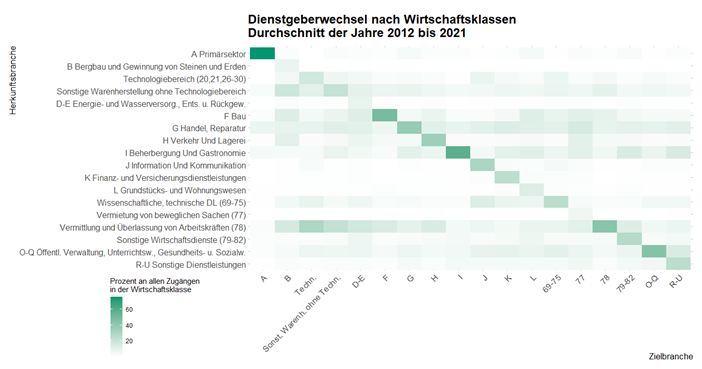 Im Durchschnitt der Jahre 2012 bis 2021 wurden in der Steiermark 493.477 unselbständig Aktivbeschäftigte verzeichnet. Im selben Zeitraum wurden pro Jahr durchschnittlich 108.254 Dienstgeberwechsel (darunter werden alle Wechsel erfasst, bei denen der Arbeitsbeginn im neuen Dienstverhältnis max. 365 Tage nach Ende des alten Dienstverhältnisses stattfand) vermerkt. Untersucht werden im Folgenden Dienstgeberwechsel, konkret woher die Beschäftigten von Unternehmen kommen: ob diese innerhalb derselben Branche gewechselt sind oder ob sie aus anderen Bereichen der Wirtschaft kommen. Für die Branchen der steirischen Wirtschaft zeigt sich damit, ob – und wenn ja, aus welchen anderen Branchen Beschäftigte gewonnen werden konnten.