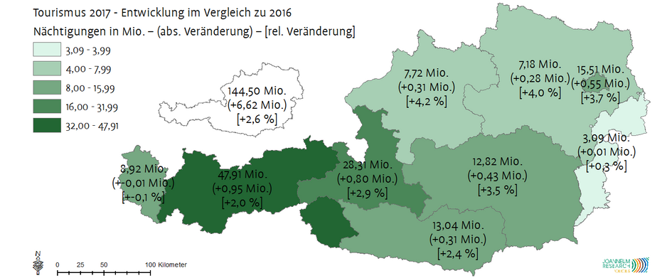 Die Anzahl der Nächtigungen stieg in der Steiermark dabei im Vergleich zu Gesamtösterreich überdurchschnittlich an, nur Oberösterreich (+4,2 %), Niederösterreich (+4,0 %) und Wien (+3,7 %) wiesen ein höheres Wachstum auf. Bei den absoluten Entwicklungen liegt die Steiermark nur hinter Tirol (+950 Tausend), Salzburg (+799 Tausend) und Wien (+550 Tausend) zurück.