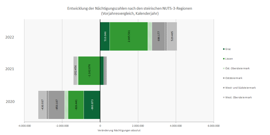 Im Kalenderjahr 2022 wurden in der Steiermark rund 13,0 Mio. Nächtigungen und damit um +4,1 Mio. Nächtigungen mehr als im Jahr zuvor erzielt. Mit einem Plus von +45,3 % im Vorjahresvergleich liegt die Steiermark im Bundesländervergleich auf Rang fünf im Mittelfeld. Die stärksten Zuwächse verzeichneten Wien mit einer mehr als Verdoppelung der Nächtigungen (+164,3 %) sowie die westlichen Bundesländer Salzburg (+93,2 %), Tirol (+89,8 %) und Vorarlberg (+86,2 %), die alle besonders stark von den internationalen Reisbeschränkungen sowie den COVID-19-bedingten Betriebsschließungen betroffen gewesen waren. Kein einziges Bundesland konnte schon im Jahr 2022 das Nächtigungsniveau vor der COVID-19-Pandemie erzielen, die Steiermark unterschritt das Vorkrisenniveau mit einem Minus von rund 0,3 Mio. Nächtigungen bzw. -2,1 % nur geringfügig.