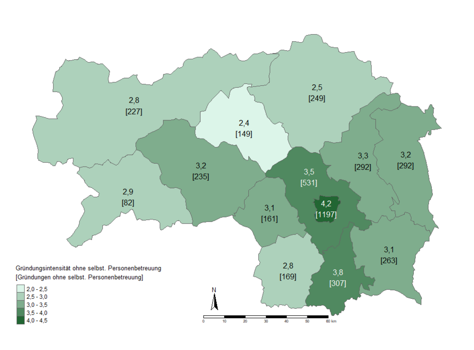 Zudem wiesen die Bezirke Leibnitz mit 3,8 und Graz-Umgebung mit 3,5 Gründungen je 1.000 Einwohner im Jahr 2017 eine überdurchschnittliche Gründungsintensität auf (Steiermark: 3,4, Österreich: 3,4).