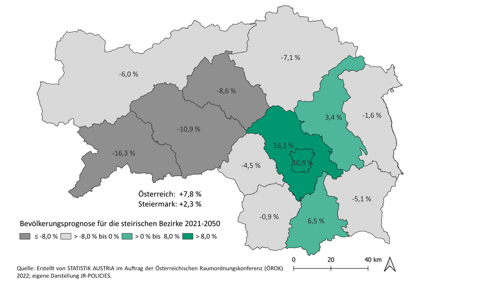 Im Bundesländervergleich wird insbesondere für Wien, aber auch für die westlichen Bundesländer Tirol und Vorarlberg, ein überdurchschnittlich hoher Anstieg der Bevölkerung erwartet. Lediglich in Kärnten wird ein Rückgang prognostiziert. Unter den steirischen Bezirken zeigt sich die dynamischste Entwicklung im Bezirk Graz-Umgebung mit einem prognostizierten Bevölkerungsplus von +7,3 % bis 2030 bzw. +16,1 % bis 2050. Im Vergleich mit der vorangegangenen Bevölkerungsprognose (aus dem Jahr 2018) wird damit für den Bezirk Graz Umgebung ein höheres, relatives Bevölkerungswachstum als im Bezirk Graz (Stadt) erwartet. Die Einwohnerzahl des Bezirks Graz (Stadt) soll hingegen gemäß der aktuellen Prognose deutlich langsamer ansteigen, als noch vor einigen Jahren erwartet. Die Bezirke Südoststeiermark, Voitsberg, Liezen, Bruck-Mürzzuschlag, Murtal, Leoben und Murau hingegen sind bereits im Zeitraum 2021-2030 mit einem Bevölkerungsrückgang konfrontiert. Am stärksten betroffen ist der Bezirk Murau, bis zum Jahr 2050 soll die Bevölkerung um -16,3 % auf 22.975 Einwohner zurückgehen (1.1.2021: 27.449 Einwohner).