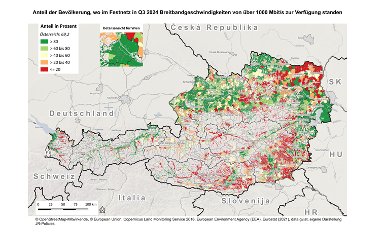 Wie weit eine flächendeckende Festnetzversorgung mit mindestens 1.000 Mbit/s in den einzelnen Bundesländern bereits erreicht ist, zeigt ein Vergleich der aktuellen Versorgungsanteile. Mit einem Anteil von 50,5 % der Bevölkerung, der Zugang zu einem Festnetzinternetanschluss mit mindestens 1.000 Mbit/s hat, liegt die Steiermark im Bundesländervergleich an siebenter Stelle. Damit bleibt sie sowohl unter dem österreichweiten Durchschnitt von 69,2 %, als auch deutlich hinter Wien (93,7 %), dem Burgenland (78,8 %), Oberösterreich (77,2 %) und den westlichen Bundesländern wie Vorarlberg (76,8 %) und Tirol (75,4 %) zurück. Nur Kärnten (36,4 %) und Salzburg (49,1 %) weisen geringere Versorgungsanteile auf, auch in Niederösterreich liegt der Deckungsgrad höher (58,9 %).