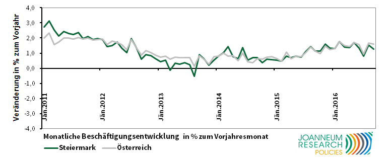 In den ersten drei Quartalen des Jahres 2016 war eine positive Beschäftigungsdynamik zu beobachten: In der Steiermark stieg die Zahl der Aktivbeschäftigten laut Hauptverband der Sozialversicherungsträger (HVSV) auf 484.076, was einem durchschnittlichen Wachstum von +1,5 % für die ersten drei Quartale entspricht. Die Wachstumsdynamik der Steiermark liegt damit leicht hinter dem gesamtösterreichischen Wachstum von +1,6 %. Gemäß den Ergebnissen der Beschäftigungsprognose für Österreich der JOANNEUM RESEARCH kann das Wachstum der Beschäftigungsverhältnisse für das Gesamtjahr 2016 mit +1,6 % gehalten werden, für 2017 wird von einem Wachstum von +1,3 % ausgegangen.