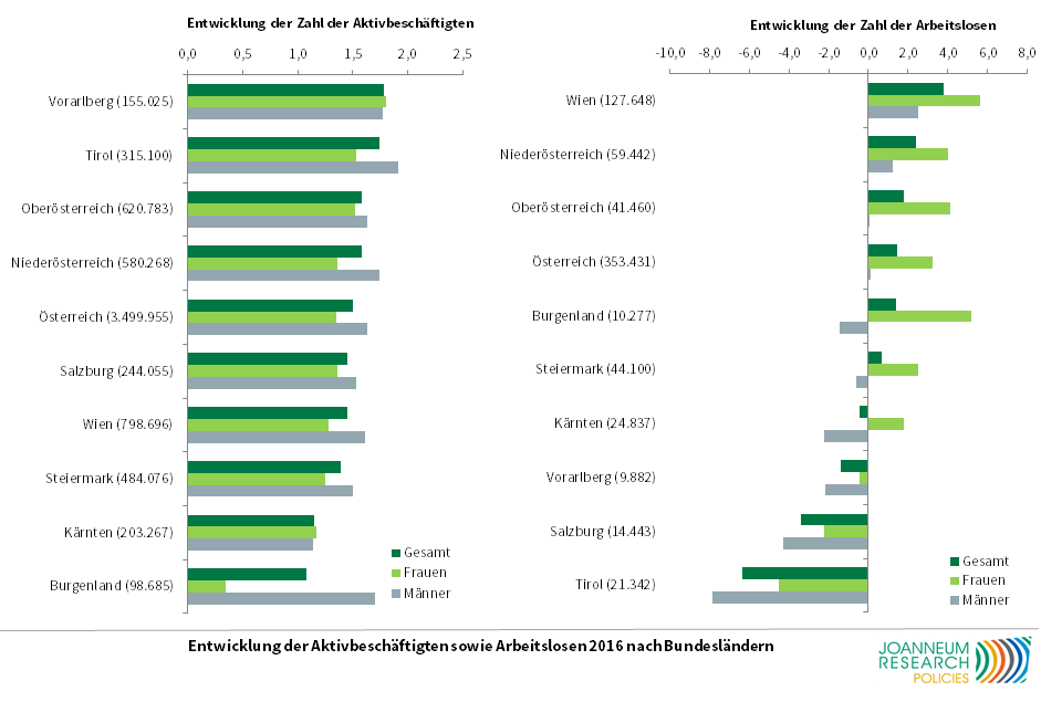 Die Prognosen des gesamtösterreichischen Wirtschaftswachstums für 2016 fallen mit +1,5 % (IHS) sowie +1,7 % (WIFO) beziehungsweise für 2017 mit +1,3 % (IHS) und +1,5 % (WIFO) etwas optimistischer aus als im Vorjahr. Erneut kann jedoch nicht davon ausgegangen werden, dass dieses Wachstum ausreicht, um die Situation am heimischen Arbeitsmarkt nachhaltig zu entspannen. Die Ausweitung der Beschäftigungsverhältnisse ist nicht umfangreich genug, um die Steigerung des Arbeitskräfteangebots, vor allem durch den Zuwachs ausländischer Arbeitskräfte, zu kompensieren (WIFO, 10/2016).