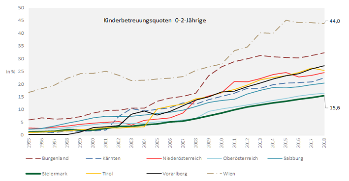 Insgesamt wurden in der Steiermark im Kindergartenjahr 2018/19 37.334 Kinder in 1.044 Kindertagesheimen bzw. 1.974 Gruppen in der Steiermark (Österreich: 9.342 Kindertagesheime) betreut. Die meisten der institutionell betreuten Kinder in der Steiermark sind in Kindergärten untergebracht (81,2 % bzw. 30.320 Kinder) hinzu kommen 4.135 Kinder in Krippengruppen/Kleinkindbetreuungsgruppen. Bezogen auf die gleichaltrige Wohnbevölkerung (Stand 1. September 2018) fällt die Kinderbetreuungsquote in der Steiermark im Bundesländervergleich am niedrigsten aus. 2018 wurden in der Steiermark 15,6 % der 0-2-jährigen Kinder in einer institutionellen Einrichtung betreut. Im Österreichschnitt wird hingegen jedes vierte Kind (26,5 %) der 0-2-Jähringen betreut, die höchste Quote erzielt die Bundeshauptstadt Wien mit 44,0 %. Auch im Bereich der 3-5-Jährigen liegt die Betreuungsquote in der Steiermark mit 88,1 % am niedrigsten (gemeinsam mit Kärnten). Die Steiermark bildet damit im Bundesländervergleich das Schlusslicht, auch im Hinblick der Erfüllung der Barcelona-Ziele (Verfügbarkeit von Betreuungseinrichtungen für 90 % der Kinder zwischen 3 Jahren bis zur Schulpflicht bzw. für 33 % der bis unter dreijährigen Kindern) besteht insbesondere bei den Jüngsten noch Aufholbedarf.