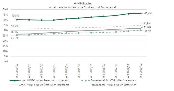 AbsolventInnen von MINT-Studien (Mathematik, Informatik, Naturwissenschaften und Technik) stellen einen wichtigen Standortfaktor für die Steiermark dar. Im Wintersemester 2019/20 wurden an den steirischen Fachhochschulen und öffentlichen Universitäten insgesamt 59.322 ordentliche Studien belegt, mit einem Anteil von 46,4 % entfiel fast die Hälfte bzw. 27.517 auf den MINT-Bereich (davon 2.758 belegte ordentliche Studien an den Fachhochschulen sowie 24.759 belegte ordentliche Studien an den Universitäten). Verglichen mit Gesamtösterreich ist der Fokus auf den MINT-Bereich damit deutlich überdurchschnittlich - österreichweit entfiel weniger als ein Drittel (31,9 %) der belegten ordentlichen Studien auf den Bereich Mathematik, Informatik, Naturwissenschaften und Technik.