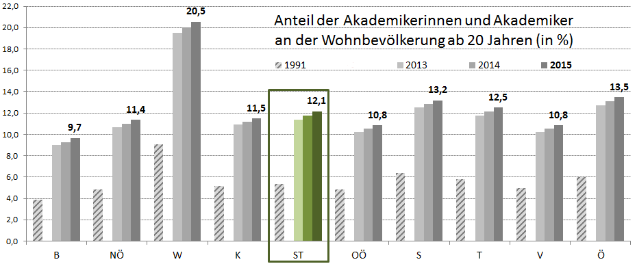 Der im Rahmen der Abgestimmten Erwerbsstatistik abgefragte Bildungsstand der österreichischen Wohnbevölkerung ergibt zum Stichtag 31.10.2015 für das Bundesland Steiermark 121.811 Absolventinnen und Absolventen von Hochschulen oder Akademien (Anteil an Österreich: 13,0 %). Gegenüber der Volkszählung 1991 ergibt dies einen Zuwachs von +76.692 Personen bzw. +170,0 % (Ö: +182,9 %). In der Steiermark wiesen somit 12,1 % der Bevölkerung ab 20 Jahre eine akademische Ausbildung auf. Damit liegt die Steiermark hinter den Bundesländern Wien (20,5 %), Salzburg (13,2 %) und Tirol (12,5 %) an vierter Stelle.