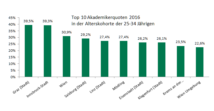 Graz weist neben einem besonders dichten Hochschulangebot durch die hohe Dichte an wissensintensiven, innovativen Unternehmen, das Gesundheits- und Sozialwesen sowie die Verwaltung auch ein hohes Angebot an hochqualifizierten Jobs auf. Gerade bei jungen Menschen zeigt sich die zunehmende Höherqualifizierung hier sehr deutlich: In der Alterskohorte von 25 bis 34-Jahren wurden in Graz (Stadt) 2016 insgesamt 20.129 Einwohnerinnen und Einwohner mit Hochschulabschluss gezählt (Anteil an Österreich: 7,7 %), seit 2011 bedeutet dies ein Plus von +5.230 Personen. Im Verhältnis zur Bevölkerung dieser Alterskohorte ergab das einen Akademikerinnen- und Akademikeranteil von 39,5 % (+4,4 %-Punkte gegenüber 2011), womit Graz (Stadt) im Steiermarkvergleich vor Graz-Umgebung (18,8 %) und Leoben (17,7 %) lag. Sogar österreichweit lag Graz (Stadt) vor Innsbruck-Stadt und Wien auf Platz 1.