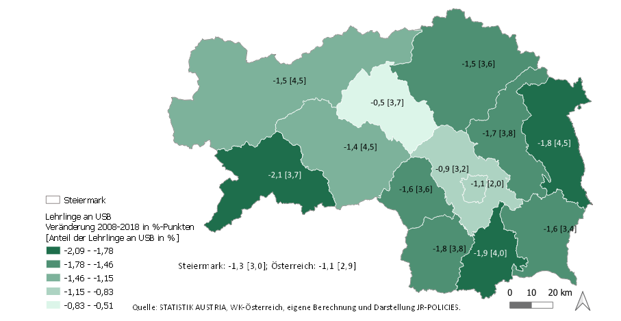 Der Trend in der Lehrlingsausbildung ist rückläufig: Im Vergleich zum Jahr 2008 ging die Zahl der Lehrlinge in der Steiermark um -21,6 % zurück. Alle Bundesländer weisen hier Rückgänge auf, wobei diese in Wien – auch aufgrund der dynamischen Bevölkerungsentwicklung – mit -7,6 % mit Abstand am geringsten ausfielen (Österreich: -18,2 %). In der Steiermark liegt die Bandbreite der Rückgänge zwischen -11,3 % im Bezirk Leoben und -35,6 % im Bezirk Murau.