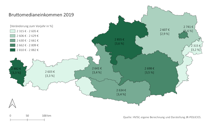 Im Jahr 2019 betrug das Bruttomedianeinkommen in der Steiermark 2.698 € (+3,5 % bzw. +90 € gegenüber 2018). Damit wurde die stärkste relative Ausweitung der letzten zehn Jahre realisiert. Die Steiermark lag damit bezüglich der Dynamik im gesamtösterreichischen Durchschnitt von ebenfalls +3,5 %. Österreichweit wurde 2019 ein Bruttomedianeinkommen von 2.741 € erreicht (+93 € gegenüber 2018).
