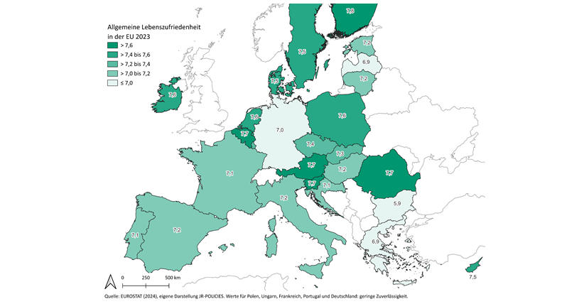 Folgt man der europäischen Statistik der Einkommens- und Lebensbedingungen (EU-SILC) zählen Österreichs Bewohner*innen zu den zufriedensten Personen in der Europäischen Union. Befragt wurden dabei Personen ab 16 Jahren wobei die Skala von 0 (überhaupt nicht zufrieden) bis 10 (vollkommen zufrieden) reicht. Österreich erzielt mit einem durchschnittlichen Wert von 7,7, gemeinsam mit Belgien, Rumänien und Slowenien den zweithöchsten Wert im Jahr 2023. Lediglich in Finnland fällt die allgemeine Lebenszufriedenheit mit 7,8 noch leicht höher aus. Am niedrigsten ist die Lebenszufriedenheit in Bulgarien (5,9), Lettland und Griechenland (jeweils 6,9). Im Vergleich mit den Vorjahren nahm die Zufriedenheit in Österreich etwas ab (2022: 7,9; 2021: 8,0).