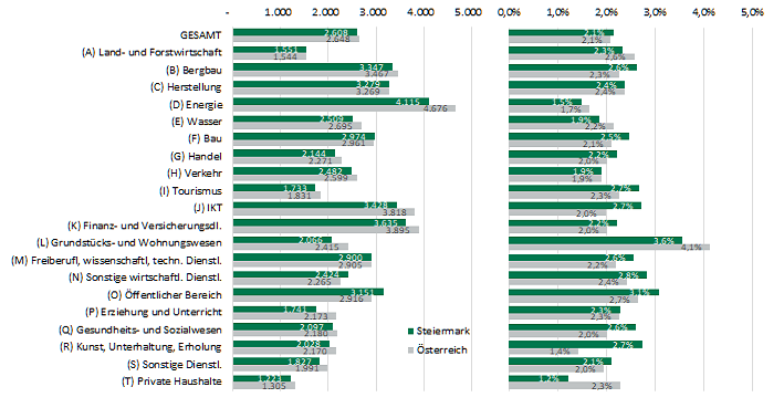 Die nachfolgende Abbildung zeigt das Bruttomedianeinkommen in € pro Monat nach Wirtschaftsbereichen für das Jahr 2018 sowie dessen durchschnittliche jährliche Entwicklung im Zeitraum 2008 bis 2018 in der Steiermark und in Gesamtösterreich.