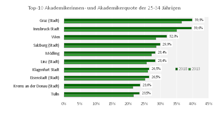 Wirft man einen Blick auf die Alterskohorte der 25-34-jährigen zeigt sich ein noch höherer Akademikeranteil. Mit einer Akademikerinnen- und Akademikerquote von 22,3 % lag die Steiermark 2018 im Bundesländervergleich nach Wien (32,0 %) an zweiter Stelle. Insbesondere bei den Jüngeren waren damit eine zunehmende Höherqualifizierung sowie das vielfältige Angebot in der steirischen Hochschullandschaft sichtbar. Der Vorsprung der Frauen wiederum fiel in der Alterskohorte der 25-34-jährigen noch deutlicher aus – mit einer weiblichen Akademikerquote von 26,2 % lag diese in der Steiermark um 7,4 %-Punkte höher als jene der gleichaltrigen Männer (Österreich: +8,7 %-Punkte bzw. weibliche Akademikerquote der 25-34-jährigen: 27,2 %). Der Bezirk Graz (Stadt) wies auch 2018 bei den 25-34-jährigen die höchste Akademikerinnen- und Akademikerquote unter allen österreichischen Bezirken aus (39,9 %), knapp gefolgt von Innsbruck-Stadt (39,6 %). Das umfangreiche Hochschulangebot in der steirischen Landeshauptstadt sowie eine hohe Konzentration an wissensintensiven, innovativen Unternehmen bietet gemeinsam mit dem Gesundheits- und Sozialwesen sowie der Verwaltung ein entsprechendes Beschäftigungsfeld für Hochqualifizierte.