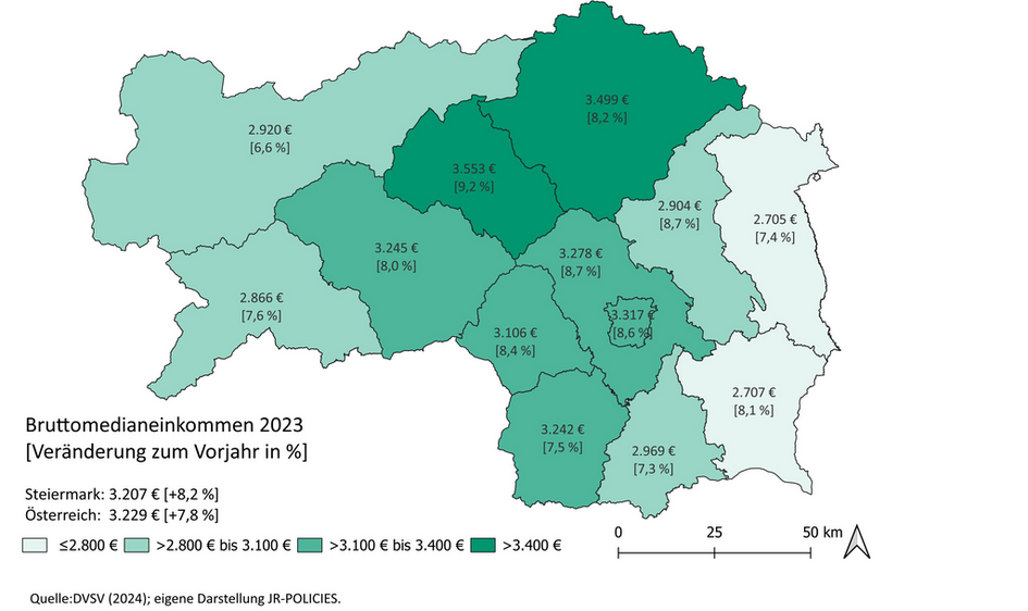 Im Bezirksvergleich werden die höchsten Einkommen (weiterhin) in den Bezirken Leoben (3.553 €) und Bruck-Mürzzuschlag (3.499 €) erzielt. Leoben wies darüber hinaus auch das stärkste Plus im Vorjahresvergleich (+9,2 %) auf, während in den Bezirken Hartberg-Fürstenfeld und Südoststeiermark die niedrigsten mittleren Einkommen mit 2.705 € bzw. 2.707 € erzielt wurden und auch die Entwicklung im Steiermarkvergleich (leicht) unterdurchschnittlich ausgeprägt war. Die Einkommensunterschiede auf Bezirksebene lassen sich insbesondere auf die Wirtschaftsstruktur zurückführen. Industriell geprägte Bezirke wie Bruck-Mürzzuschlag und Leoben profitieren, wohingegen Bezirke mit einer überwiegend dienstleistungsorientierten Wirtschaftsstruktur ein niedrigeres Bruttomedianeinkommen aufweisen. Generell werden die höchsten Einkommen in der Steiermark im Bereich der Energieversorgung erzielt (ÖNACE D, 4.843 €), wobei im Produktionssektor auch im Bereich der Herstellung von Waren (ÖNACE C, 3.987 €), dem Bergbau (ÖNACE B, 3.933 €) und auch im Bauwesen (ÖNACE F, 3.623 €) überdurchschnittlich hohe Einkommen erreicht werden. Im Dienstleistungsbereich hingegen werden die höchsten Einkommen im IKT Bereich (ÖNACE J, 4.146 €) sowie in den Finanz- und Versicherungsdienstleistungen (ÖNACE K, 4.056 €) erzielt. In der Steiermark überdurchschnittlich hohe Einkommen weisen im tertiären Bereich darüber hinaus auch noch der Öffentliche Bereich (ÖNACE O, 3.545 €) sowie der Bereich der Erbringung von freiberuflichen, wissenschaftlichen und technischen Dienstleistungen (ÖNACE M, 3.315 €) auf. Letzterer Bereich punktete im Vorjahresvergleich relativ betrachtet auch mit dem höchsten Einkommensplus. Die niedrigsten Einkommen wurden weiterhin im Bereich der privaten Haushalte (ÖNACE T, 1.566 €), der Land- und Forstwirtschaft (betrifft nur unselbständig Beschäftigte) (ÖNACE A, 1.939 €) sowie der Beherbergung und Gastronomie erzielt (ÖNACE I, 2.100 €), wenngleich der Einkommensanstieg in der Beherbergung und Gastronomie mit +8,3 % im Jahr 2023 zumindest leicht überdurchschnittlich ausfiel.